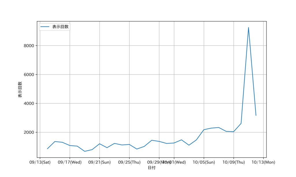 2025年9月14日~10月12日までの表示回数の推移を示す。