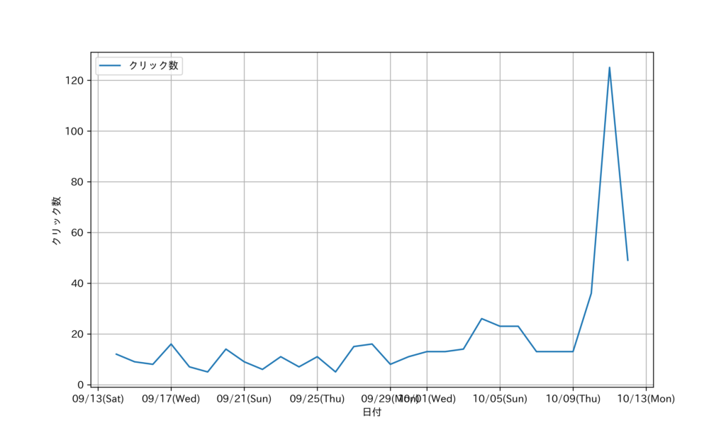 2025年9月14日~10月12日までのクリック数の推移を示す。