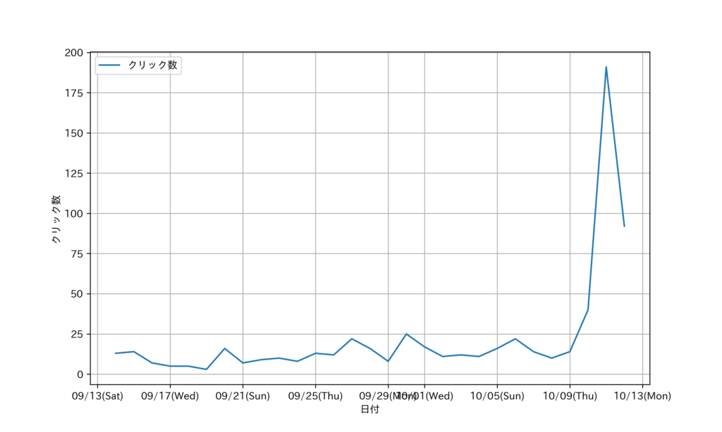 2025年9月14日~10月12日までのクリック数の推移を示す。
