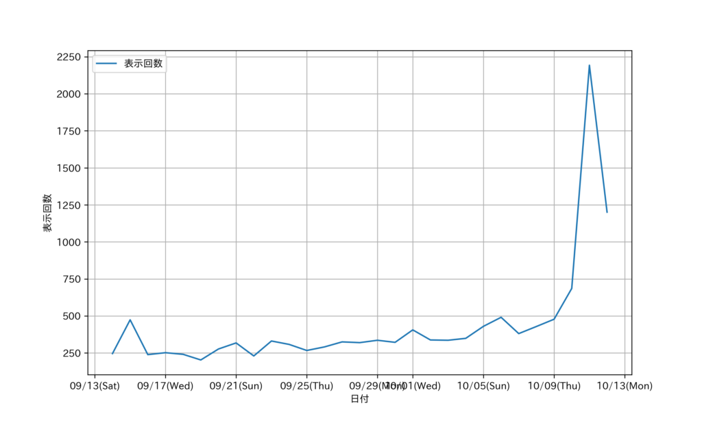 2025年9月14日~10月12日までの表示回数の推移を示す。