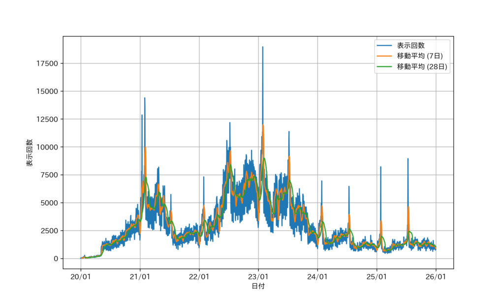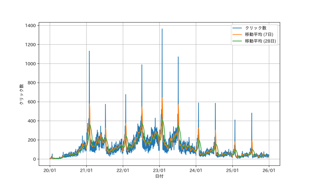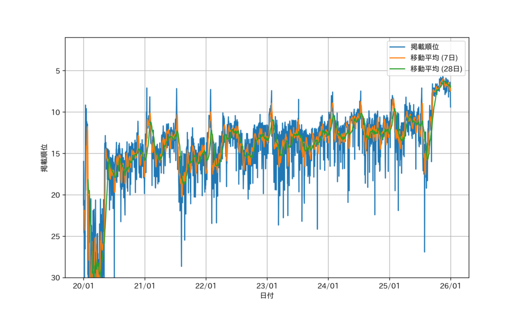 いずれの時系列データにおいても,Google Search Console より取得した日次データは青線,7 日移動平均 moving average (7 days) は赤線,28 日移動平均 moving average (28 days) は緑線で示す。
