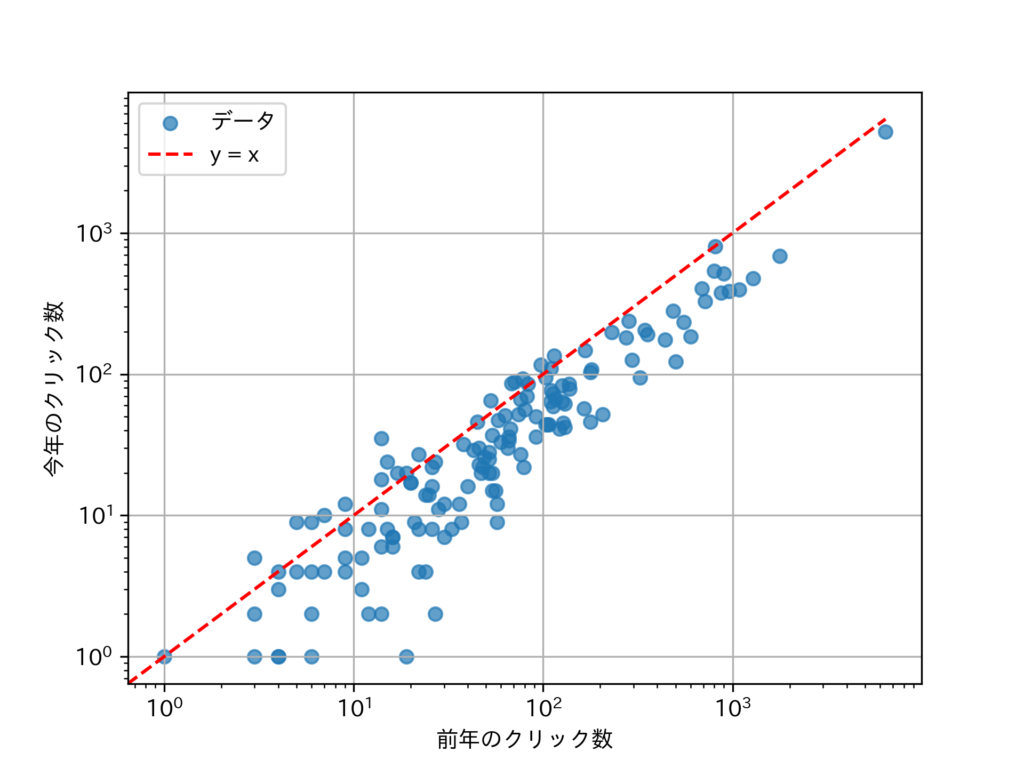 前年(2024 年)のクリック数を横軸,今年(2025 年)のクリック数を縦軸とした散布図を示す。y = x よりも上にある点は,前年よりもクリック数が増加したページである。