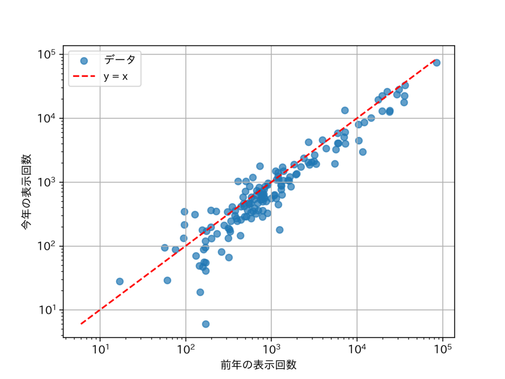 前年(2024 年)の表示回数を横軸,今年(2025 年)の表示回数を縦軸とした散布図を示す。y = x よりも上にある点は,前年よりも表示回数が増加したページである。