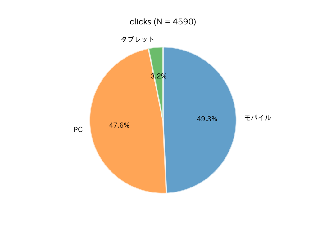 クリックに用いられたデバイスの 49.3 % はモバイルである。前年の 48.5 % とほぼ同じ割合であり,モバイルと PC のクリック数は拮抗している。