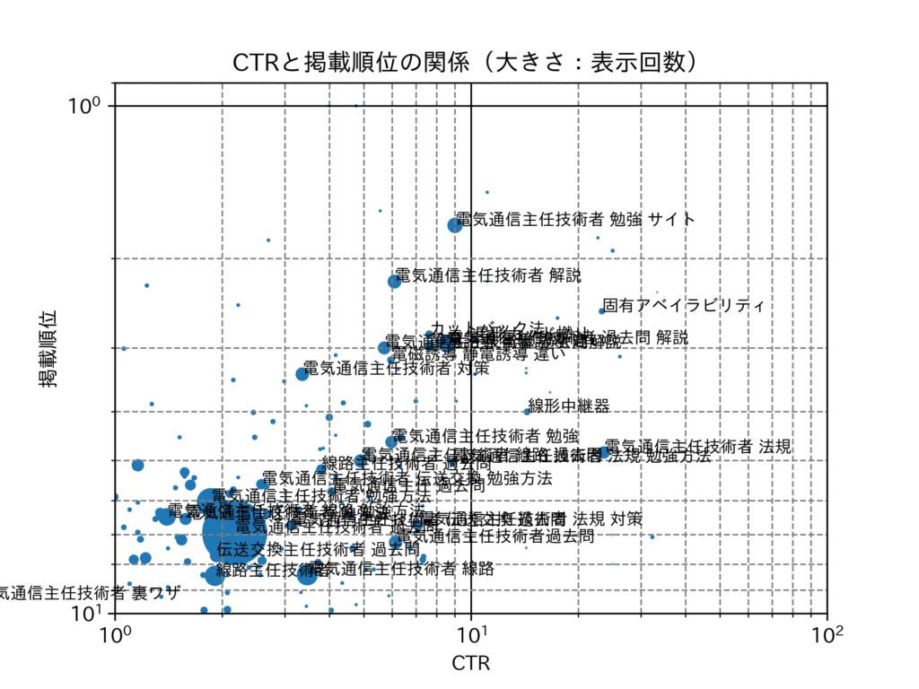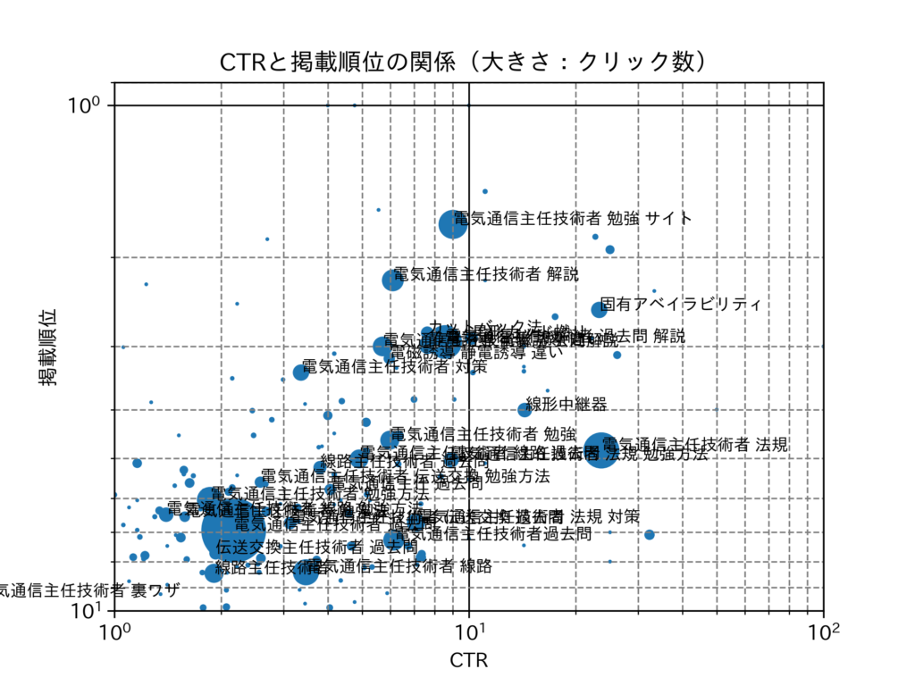 ページの CTR を横軸,掲載順位を縦軸とし,クリック数や表示回数をバブルの大きさで示したバブルチャートを用いて分析した。クリック数が上位のクエリにはデータラベルを付与している。