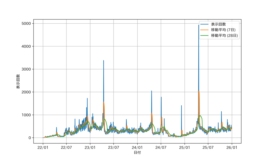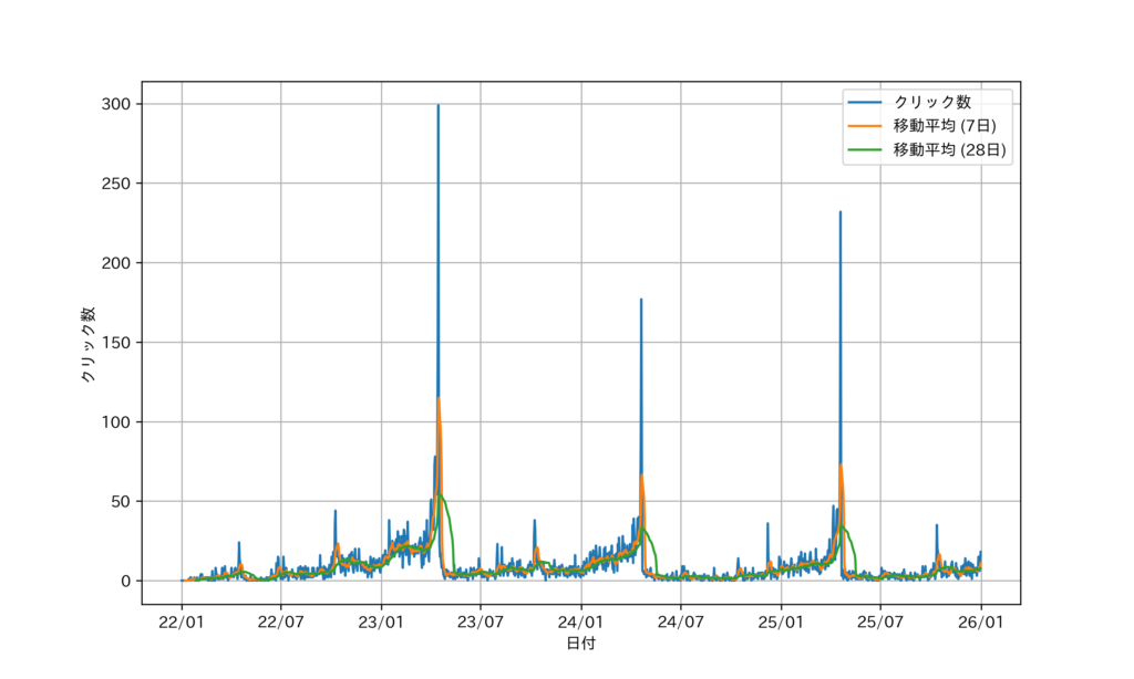 いずれの時系列データにおいても,Google Search Console より取得した日次データは青線,7 日移動平均 moving average (7 days) は赤線,28 日移動平均 moving average (28 days) は緑線で示す。